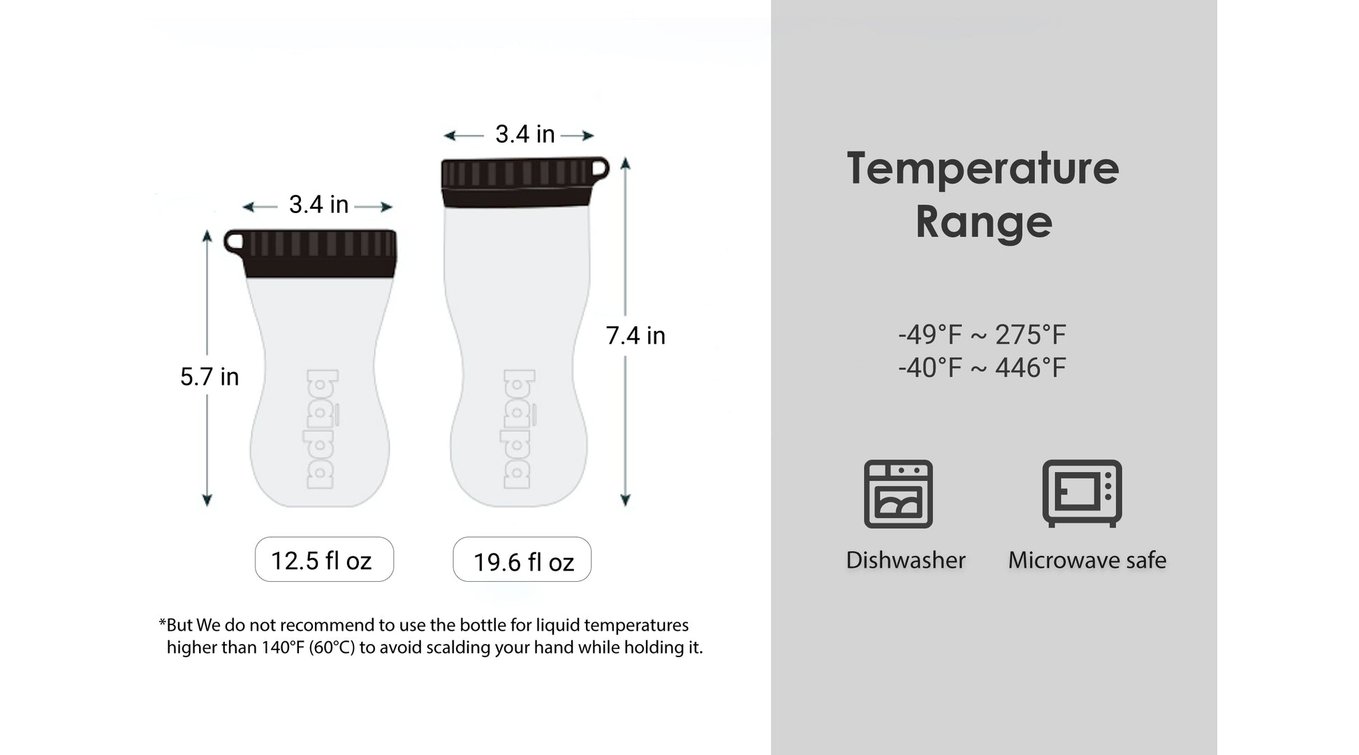 The food-grade silicone (BPA free) is soft and flexible while also very durable. The body can be exposed to temperatures ranging from -40°C to 230°C, while the plastic cup lid can range from temperatures -40°C to 110°C. The bāpa water bottle is dishwasher and microwave safe.