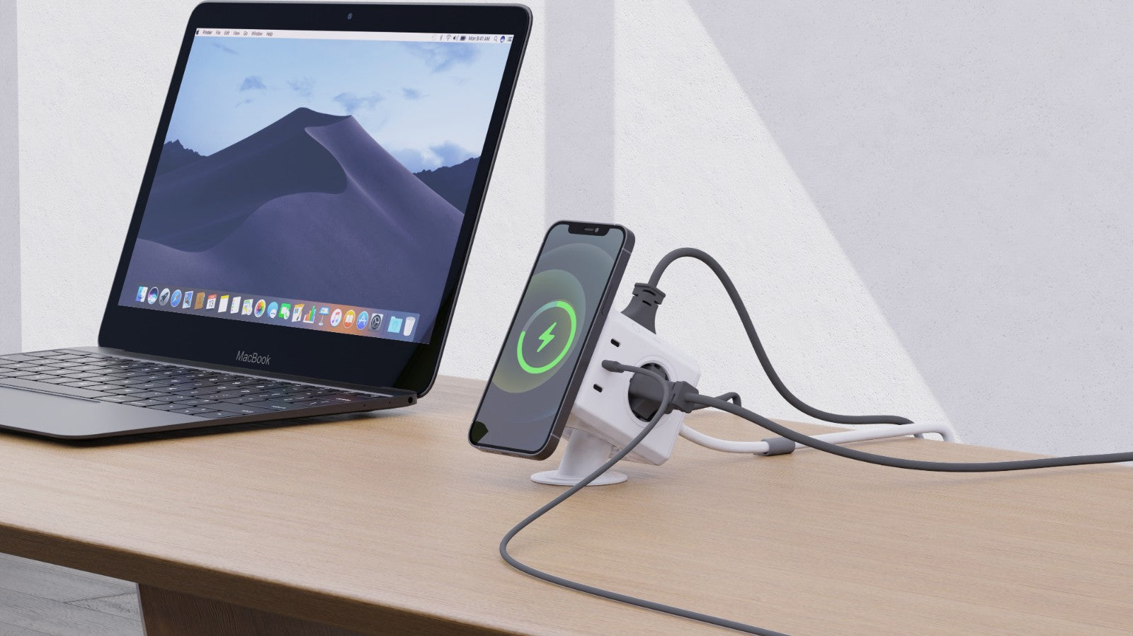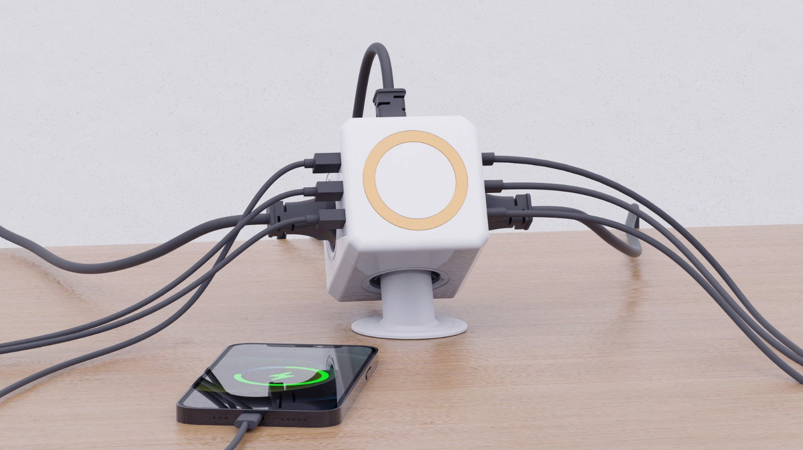 The base allows you to fix the PowerCube on your desk so you always have power within reach. The base also puts the PowerCube in an elevated angled position to make it easy and convenient placing your phone on the wireless magnetic charger.